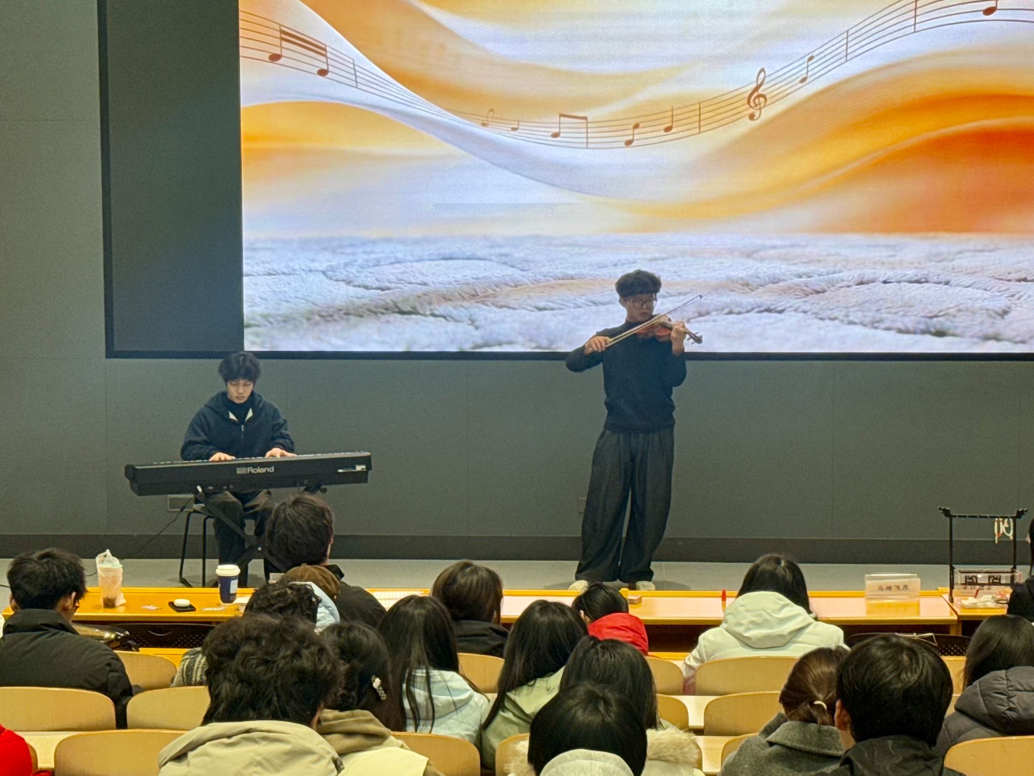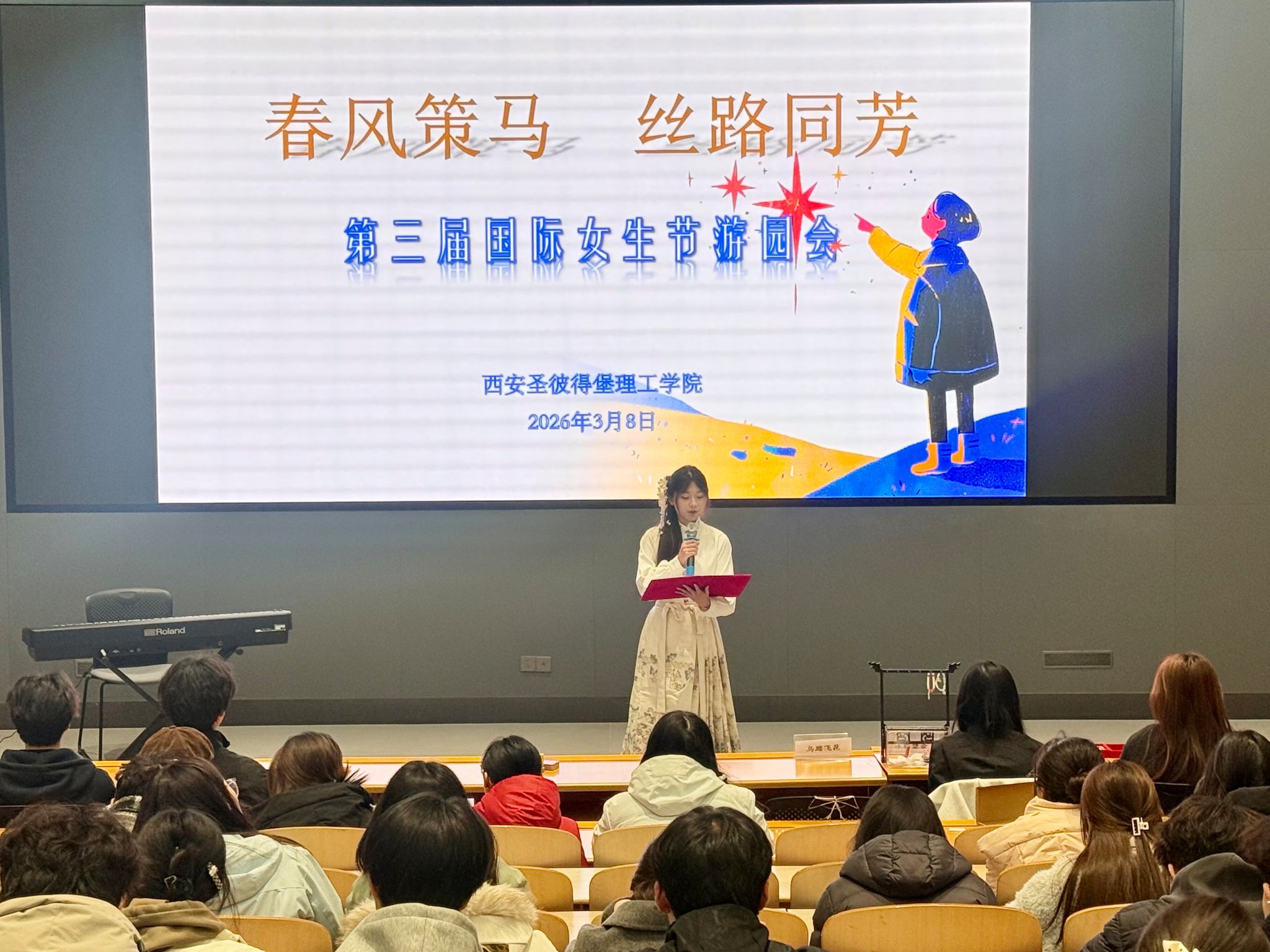 活动在主持人热情洋溢的开场致辞中拉开帷幕。在简要介绍本次女生节“春风策马,丝路同芳”的主题内涵与游园规则后,文艺部赖俊桦、孙天行同学以一曲悠扬婉转的《圣诞快乐劳伦斯先生》乐器合奏奠定了温馨基调,赢得阵阵掌声。