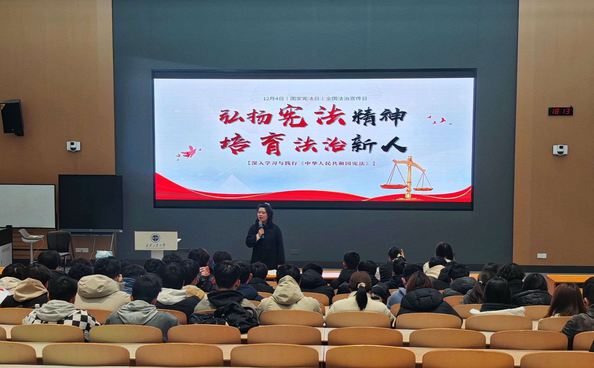 王朦月老师围绕宪法的根本地位、历史发展、青年关联、实践要求及政治与法治关系等方面展开讲解。她指出,宪法是国家的根本法,是治国安邦的总章程,与每位青年的成长发展密切相关。王老师结合宪法条文与学生实际,重点阐释了公民的基本权利与义务、宪法与国家主权、劳动与就业保障等内容,引导学生理解宪法精神、树立法治观念;并强调,青年学生应自觉成为宪法的崇尚者、遵守者和捍卫者,将宪法学习融入日常言行,在法治实践中锤炼品格、贡献力量。整场讲授内容详实、贴近实际,现场学生认真聆听、积极互动,反响热烈。