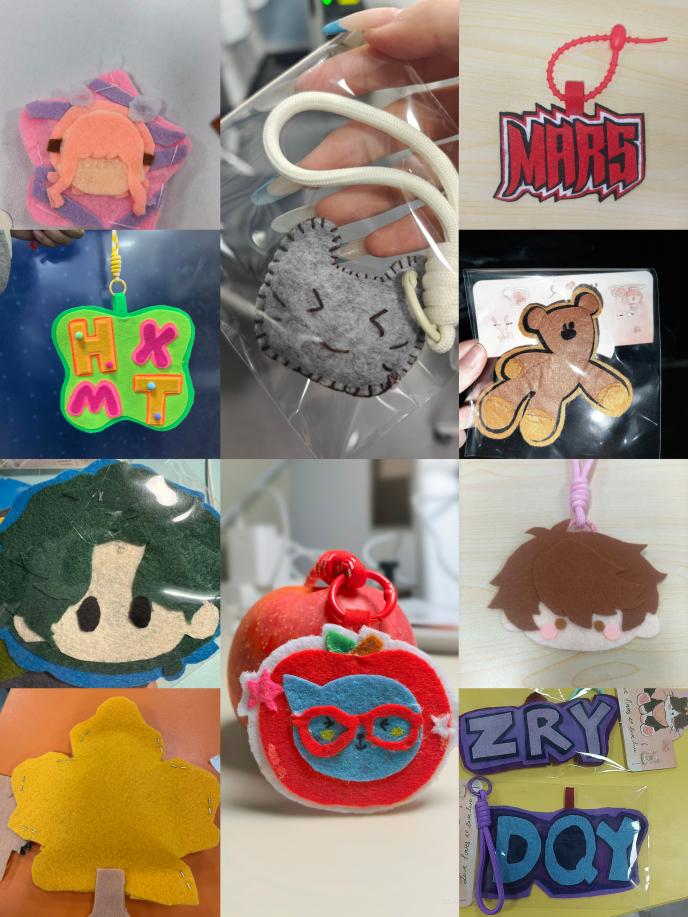 活动现场,同学们以针线为笔,以不织布为纸,自由创作个性钥匙扣。大家专注地伏于桌前,裁剪、缝制、填充、装饰,每一个步骤都凝聚着耐心与细致。有人低头穿针引线,神情安然;有人细细描摹图案,反复调整;也有人在与邻座的轻声交流中分享技巧与灵感。一针一线间,白日的焦虑渐渐沉淀,思绪随指尖的动作变得清晰而宁静。同学们在剪裁、缝制的过程中放下烦恼,纾解压力,沉浸式感受着手工带来的治愈力量。随着一件件充满创意和个性的挂件在指尖诞生,现场氛围轻松又温暖。